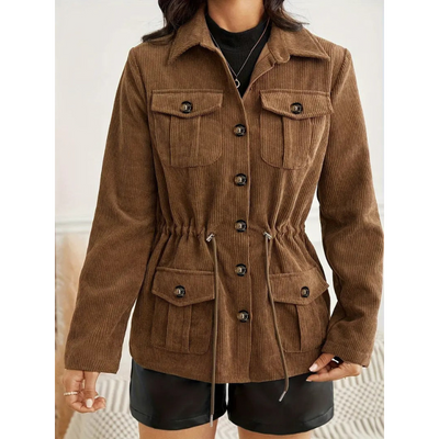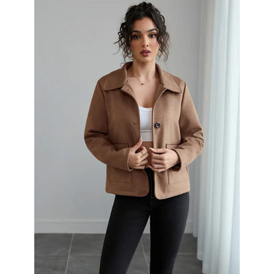 Braune Damenjacke mit Knopfverschluss und Kontrastknöpfen