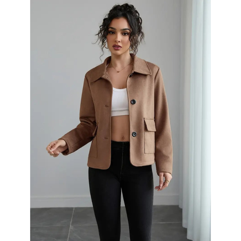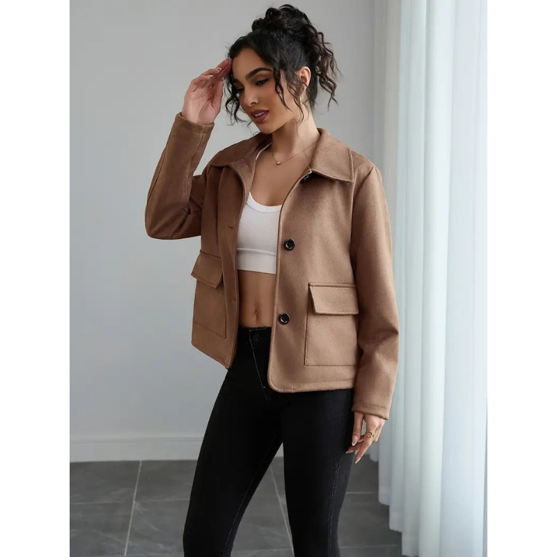 Damen Braune Jacke mit Knopfverschluss – Kontrastknöpfe ist die stilvolle Ergänzung für jede Garderobe. Diese Jacke vereint klassische Silhouette mit modernen Details, ideal für legere und schickere Anlässe.