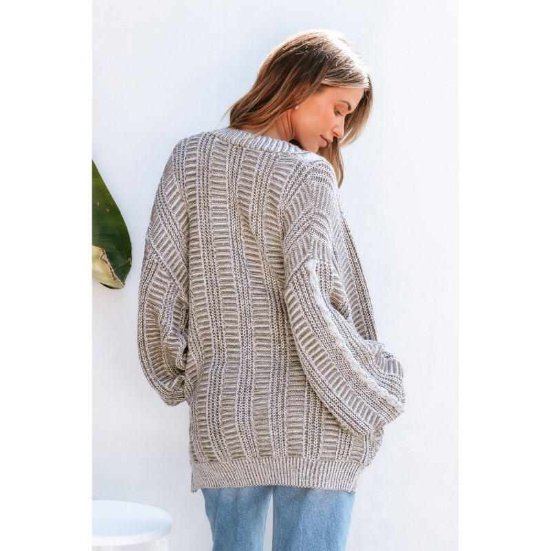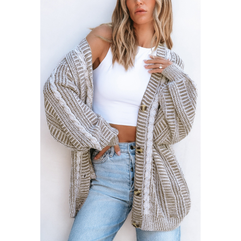 Die Damen Rippstrick-Weste mit Streifendetail – Hellbraun/Grau vereint subtile Eleganz mit modernem Design. Das gesprenkelte Strickmuster und die vertikalen grauen Streifen an den Seiten verleihen zusätzliche Tiefe.