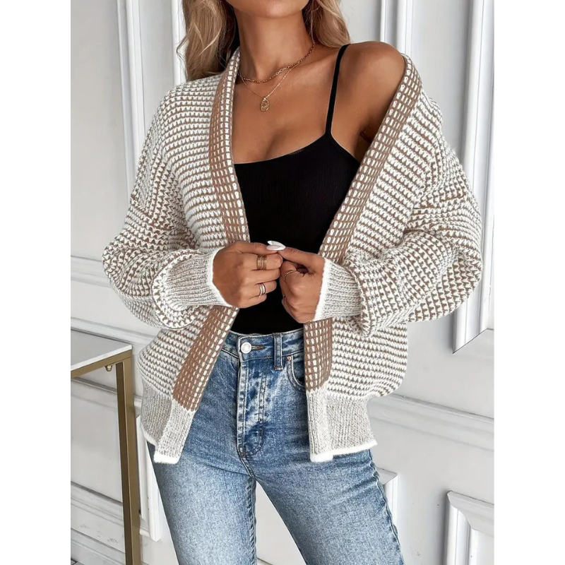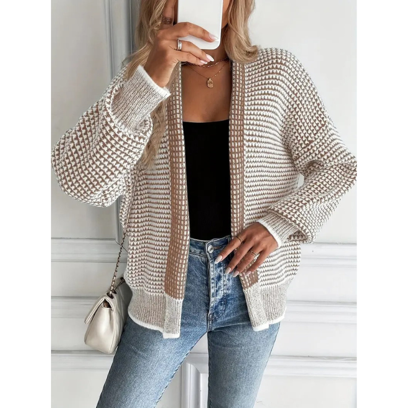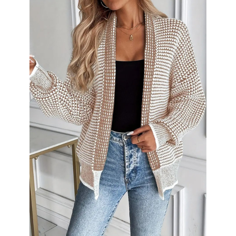 Entdecken Sie das Nora Cardigan – eine perfekte Kombination aus modernem Design und zeitloser Eleganz. Dieses offene Damenjäckchen präsentiert sich mit einer raffinierten Waffelstruktur, die für ein subtiles Relief und eine luxuriöse Ausstrahlung sorgt.