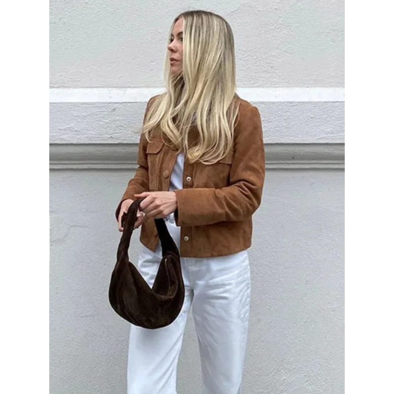 Die Ravina Wildleder Damenjacke bringt einen Hauch von raffinierter Eleganz in jede Garderobe. Hergestellt aus hochwertigem, weichem Wildleder, bietet sie einen zeitlosen Look, der sowohl zu lässigen als auch zu eleganten Outfits passt.